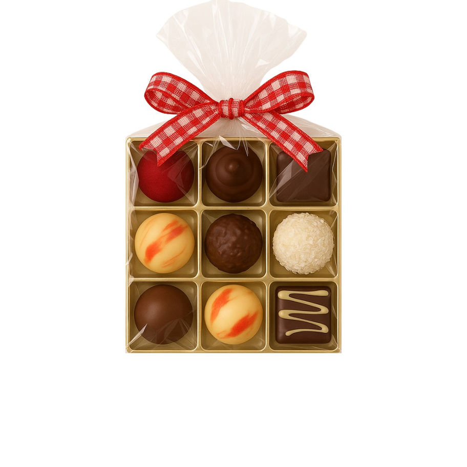 Neun kleine Kunstwerke in einer Box: Feinste Schokolade, edle Nüsse, aromatische Früchte und ausgewählte Füllungen – handgefertigt für Genussmomente voller Eleganz und Vielfalt.